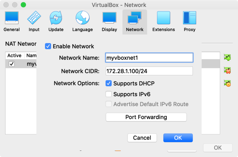$ VBoxManage natnetwork add --netname myvboxnet1 --network "172.28.1.100/24" --enable --dhcp on在 VirtualBox 中会是这样
