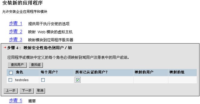 下载 TestJdbcRegistry.zip,改名为 TestJdbcRegistry1.war,然后部署到 WAS 的 server1 服务器上,取上下文根为 test1, 部署过程只有第 4 步与通常不同。如下图,需要勾选上 所有已认证的用户。其他都一样的。