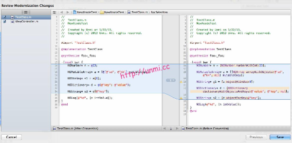 2[options objectForKey: @"backup"];上面那些用法就是 Modern Objective-C,想在老项目中跃跃欲试了吧。Xcode 4.4 为我们提供了迁移工具,Edit -> Refactor -> Convert to Modern Objective-C Syntax,Xcode 帮我们找到项目中所有上面的老语法,代之以新的语法,还有预览: